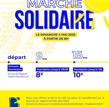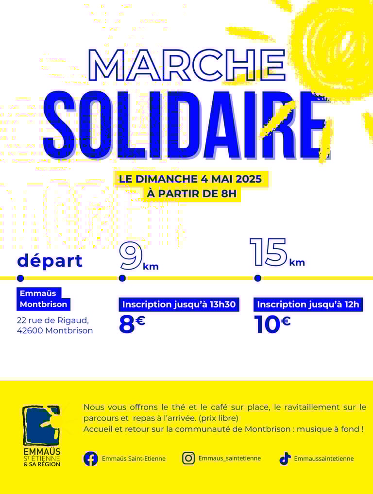 Emmaüs Saint-Étienne et sa région vous invitent à participer à une grande marche solidaire qui aura pour point de départ : Emmaüs Montbrison, situé au 22 rue de Rigaud, 42600 Montbrison.